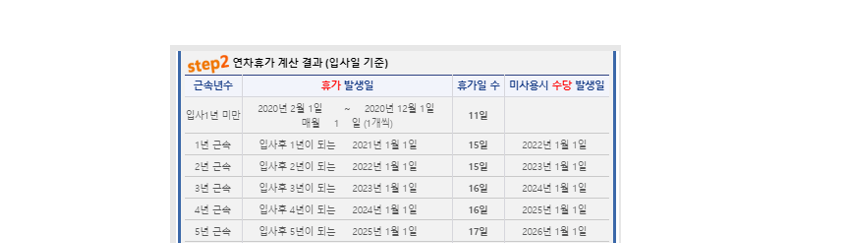 1년 미만일 때부터 시작하여 1년 근속, 2년 근속, 3년 근속으로 올라가며 휴가 발생일, 휴가일수 그리고 미사용시 수당이 발생되는 날짜까지 구체적으로 표기됩니다.