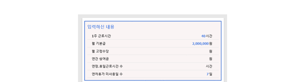 먼저 알아보았던 사용되지 않은 연차 일수를 입력하여 계산을 하게 되면 한 번에 연차수당 계산방법대로 자동화되어 표시됩니다.