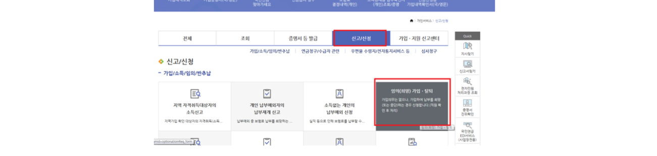 신고 및 신청란에서 국민연금 임의가입 (희망), 탈퇴 메뉴에서 진행할 수 있습니다.