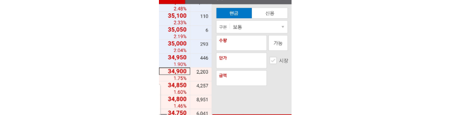 호가창을 볼 수도 있고 수량, 단가, 매수, 매도 등 주문체결 모든 기능이 활성화되어 있습니다.
